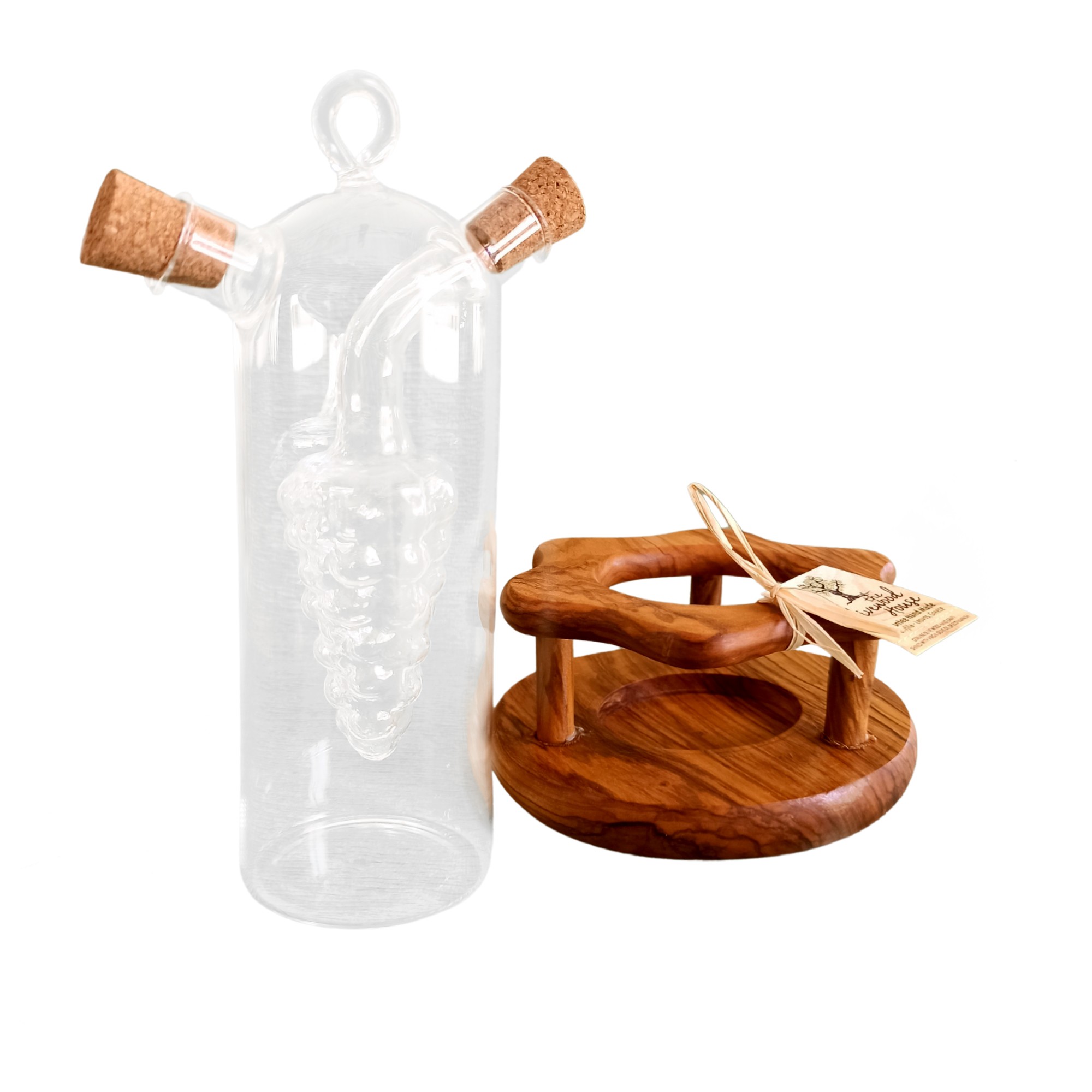 Διάφανο μπουκάλι για το λάδι και το ξύδι 2 σε 1 σε καταπληκτική βάση με ξύλο ελιάς